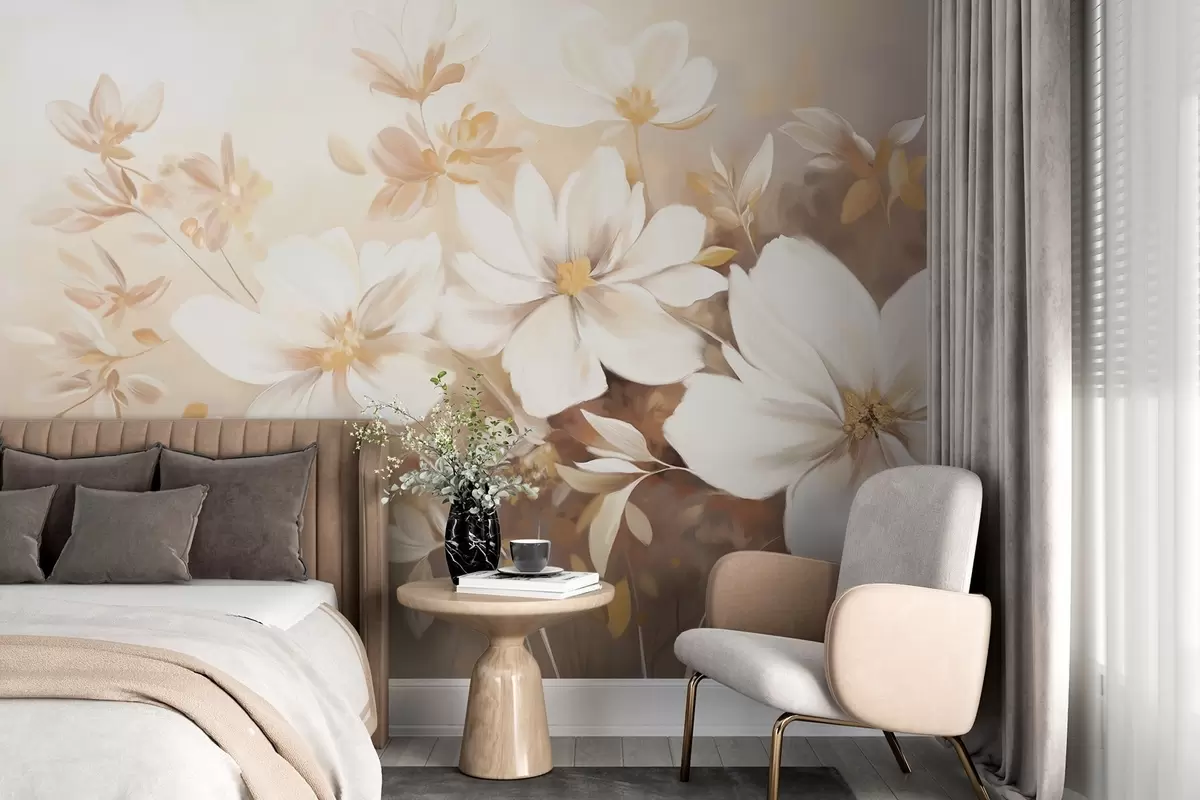 Fototapet Flori albe pictate cu petale moi și frunze delicate, pe un fundal bej deschis și crem Nr. w08780