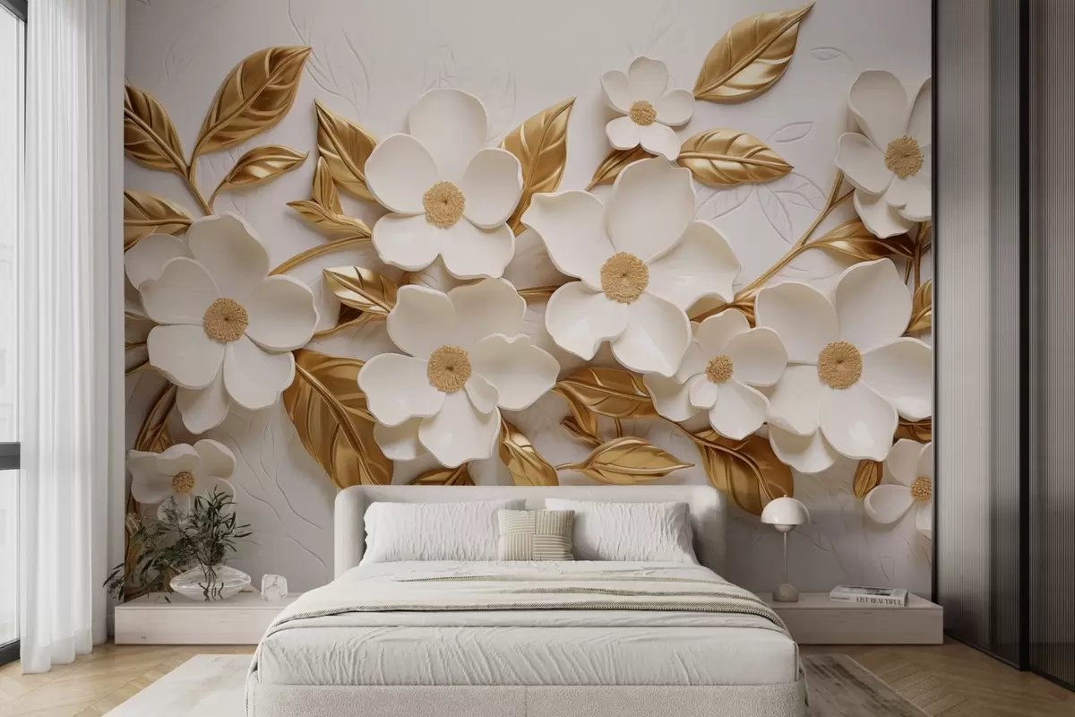 Fototapet flori albe 3D cu frunze galbene în relief Nr. w08814