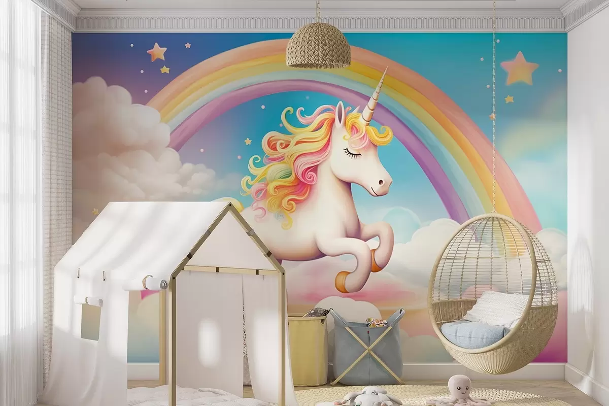 Fototapet Un cal unicorn cu un curcubeu, nori și un cer înstelat Nr. w08820