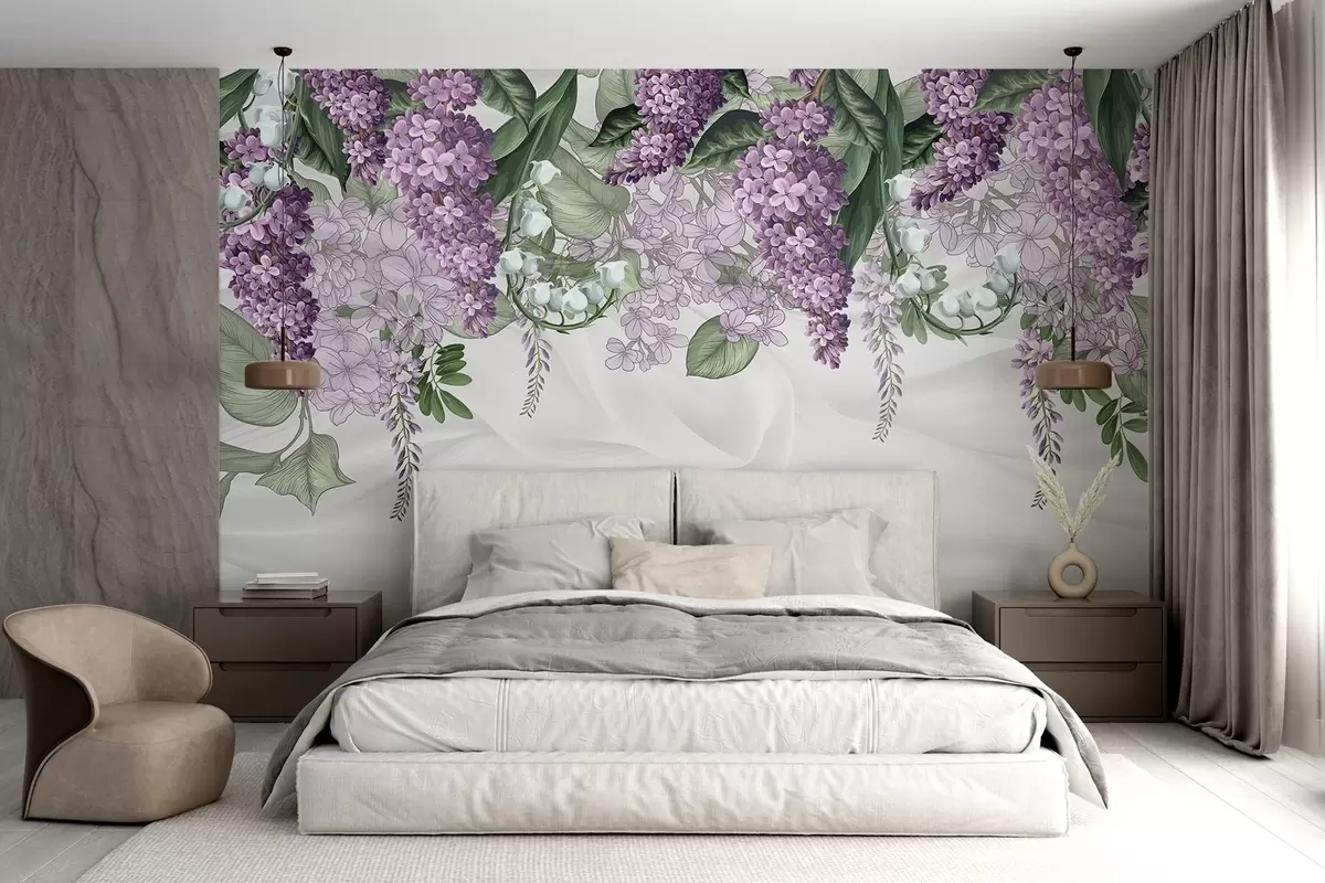 Fototapet Flori liliachii pastelate și frunze verzi pe un fundal alb cu imitație de mătase fabriс textură Nr. w08825