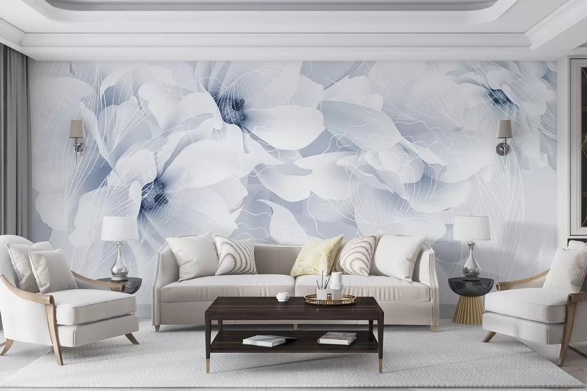 Fototapet Flori pastelate de bujor cu petale delicate albe și albastre și linii albe pe un fundal albastru deschis Nr. w08826