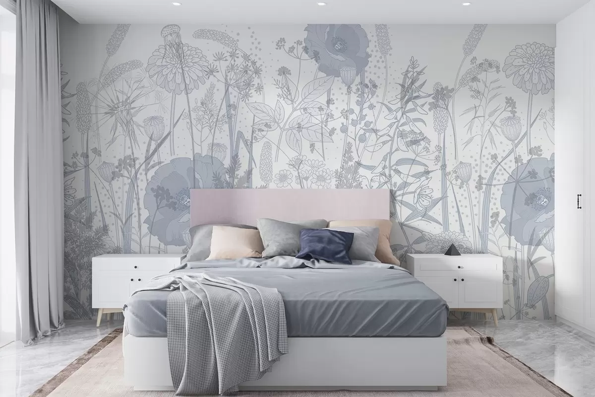 Fototapet Un câmp de flori înalte și iarbă în tonuri pastelate albastru deschis pe un fundal alb Nr. w08829