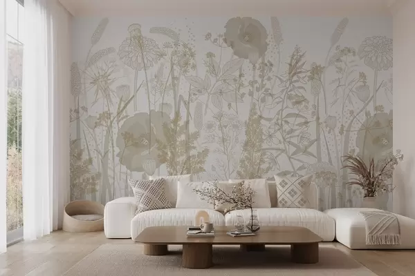 Fototapet Un câmp de flori înalte și iarbă în tonuri pastelate bej deschis pe un fundal alb Nr. w08829v1