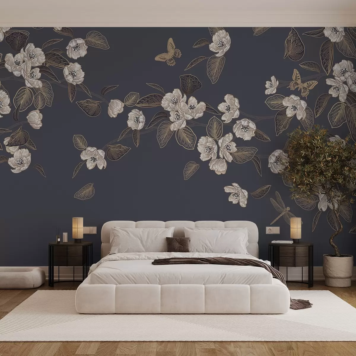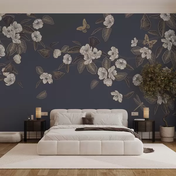 Fototapet Cireș ramură de floare de copac cu flori, frunze, fluturi pe un fundal gri închis Nr. w08830