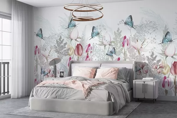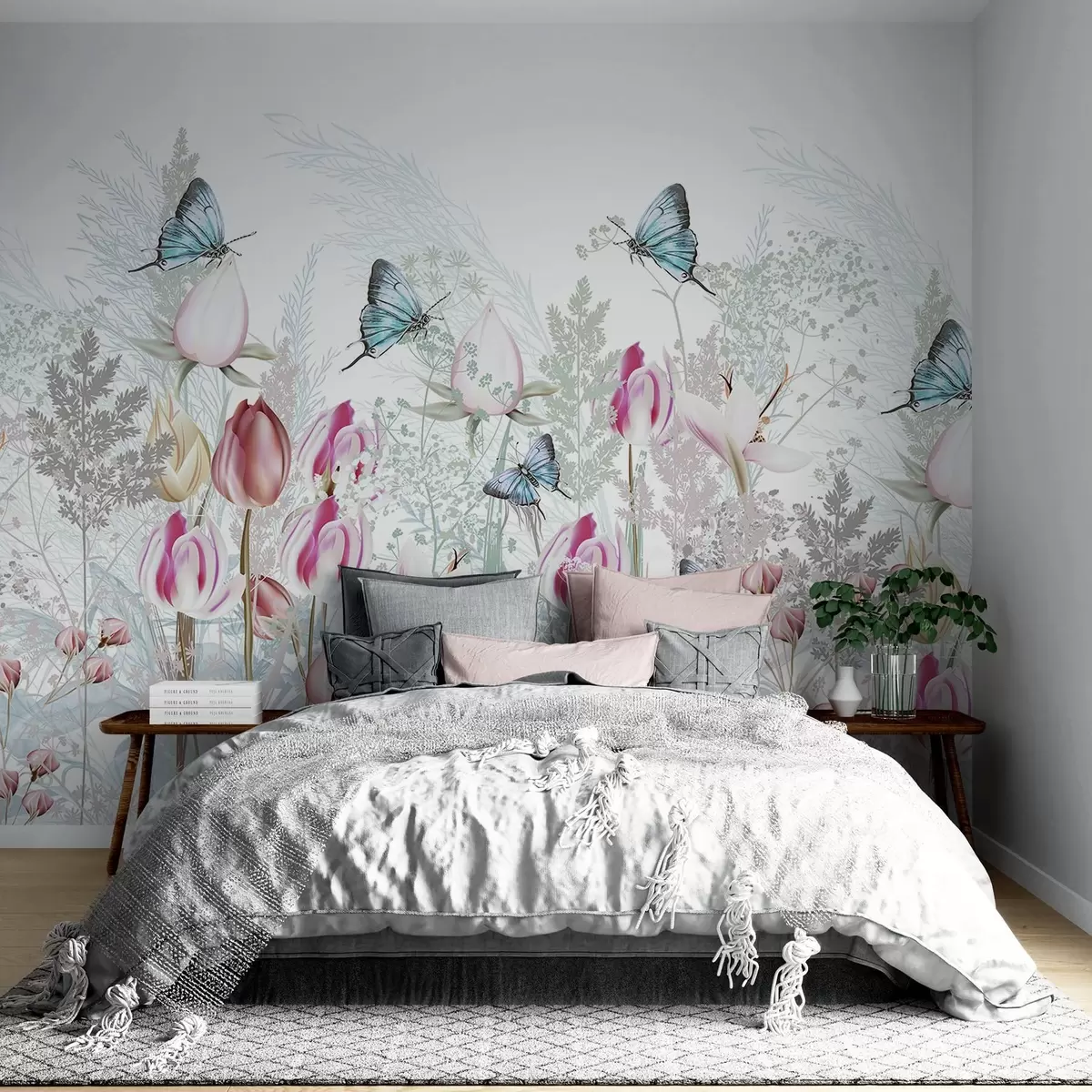 Fototapet Print pastel cu flori de lalele, iarbă și fluturi care zboară într-o grădină Nr. w08834