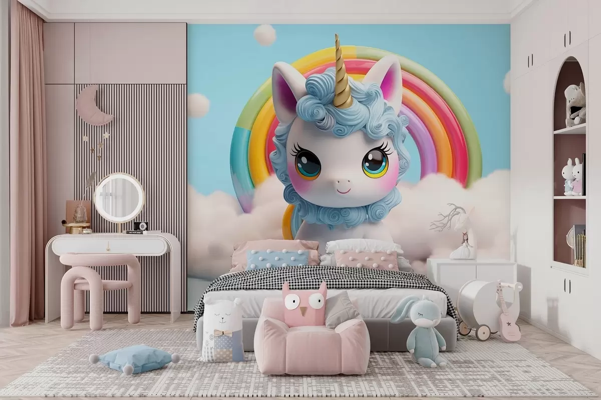 Fototapet Un unicorn drăguț 3D înconjurat de nori și un curcubeu Nr. w08848