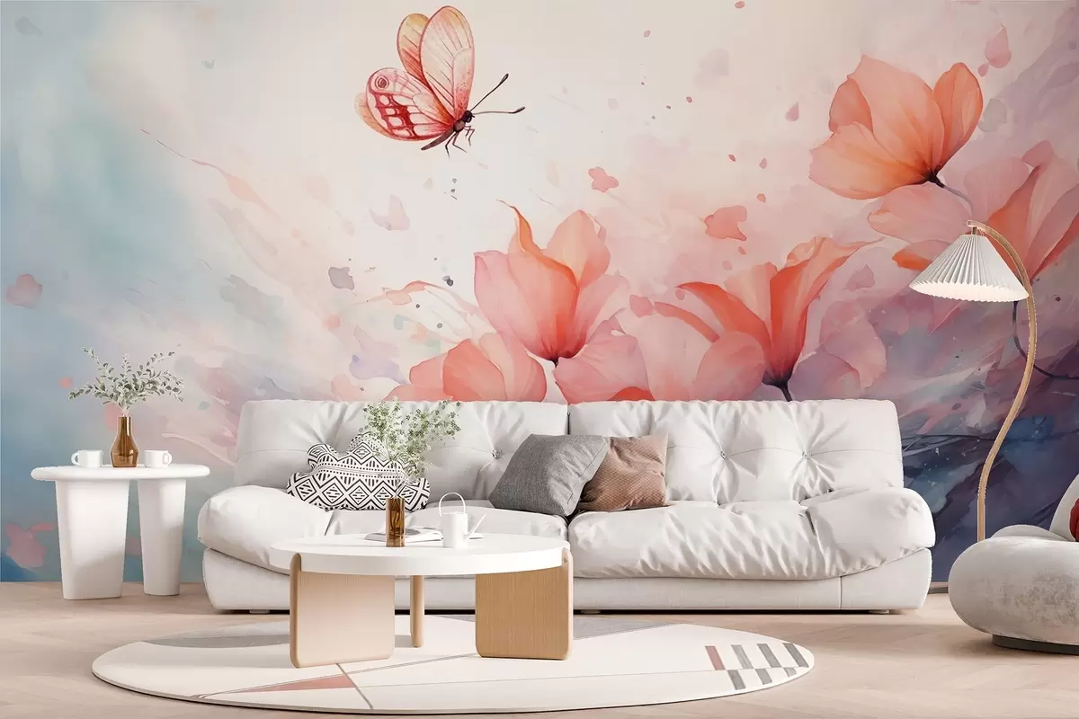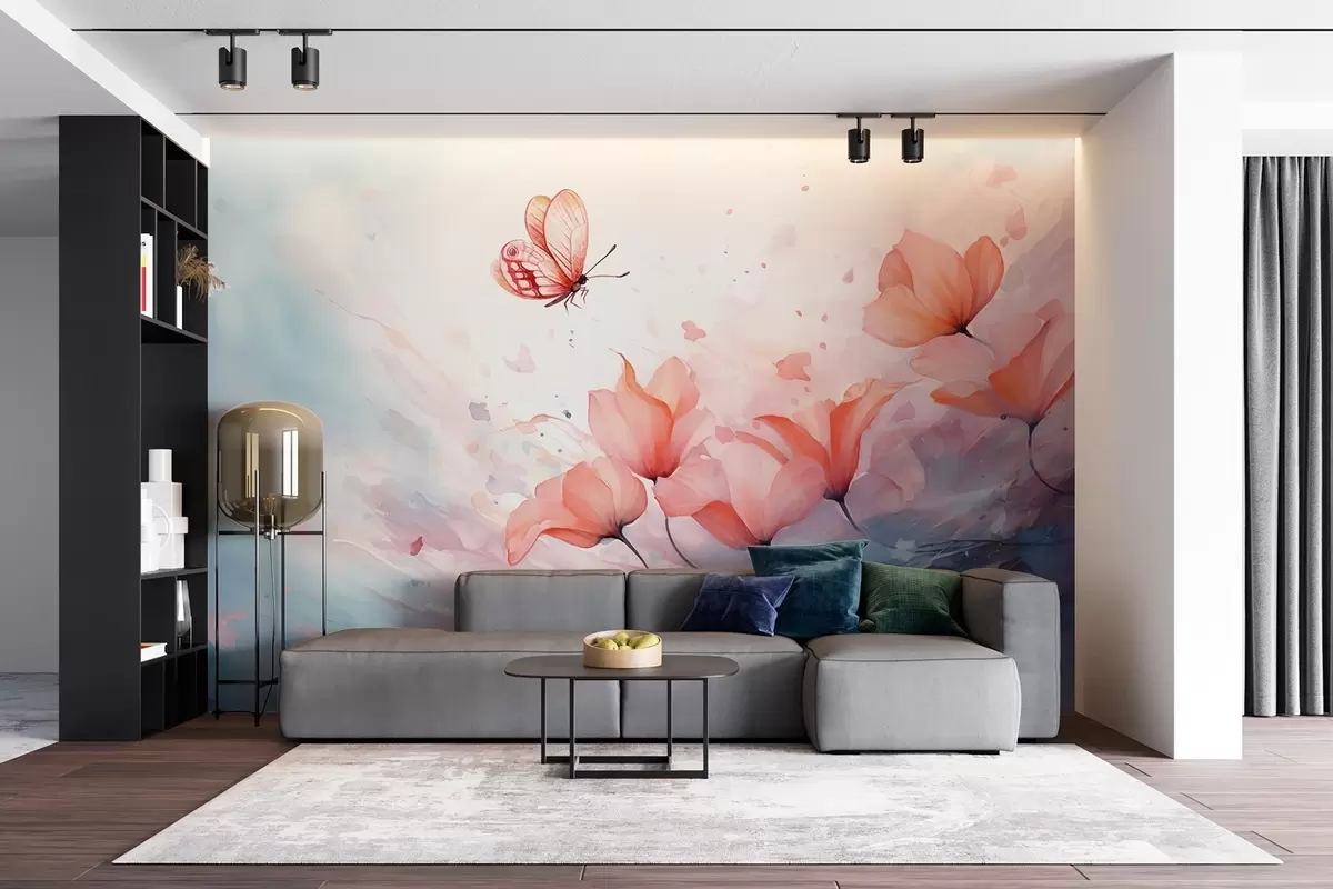 Fototapet Poppy delicat cu un fluture într-un stil acuarelă Nr. w08849