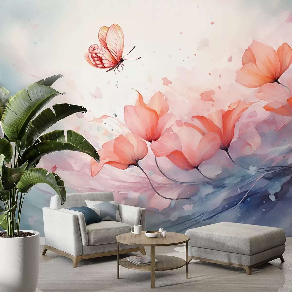 Fototapet Poppy delicat cu un fluture într-un stil acuarelă Nr. w08849
