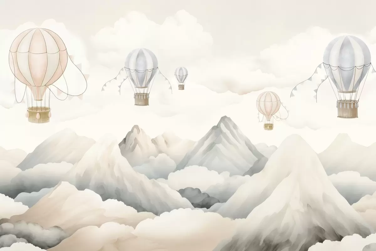 Fototapet Baloane cu aer cald plutind deasupra munților în tonuri pastelate neutre și moi Nr. w08853