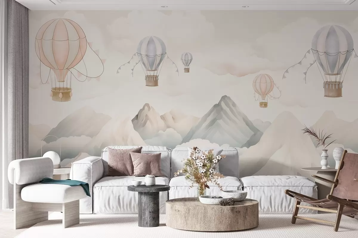 Fototapet Baloane cu aer cald plutind deasupra munților în tonuri pastelate neutre și moi Nr. w08853