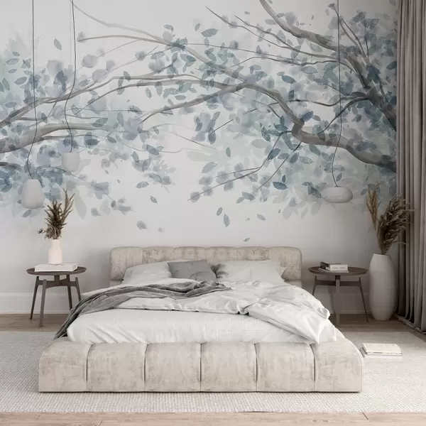 Fototapet Ramuri de flori cu frunze albastre, culori moi, detalii delicate, stil acuarelă, pe un fundal deschis Nr. w08867v2