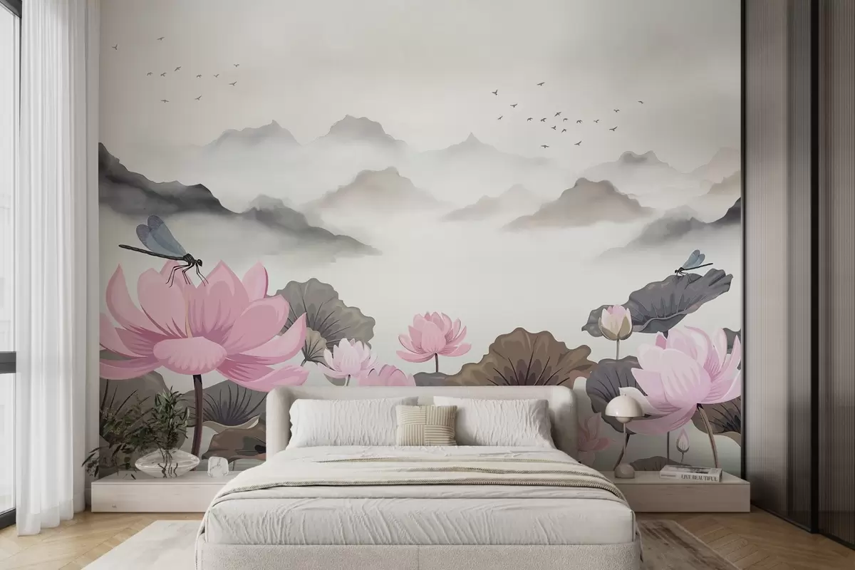 Fototapet Munți cu păsări în stil acuarelă, cu nuferi și libelule în prim-plan Nr. w08872