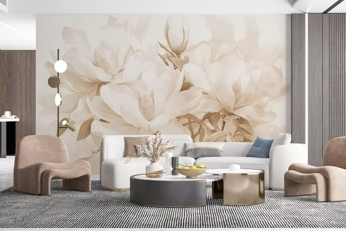 Fototapet Flori de magnolie cu petale albe și bej, frunze și ramuri maro, stil acuarelă moale și delicat Nr. w08886