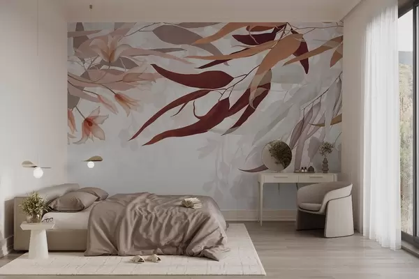 Fototapet Frunze de eucalipt în nuanțe de bordo, bej și alb cu flori delicate și ramuri pe un fundal alb Nr. w08887