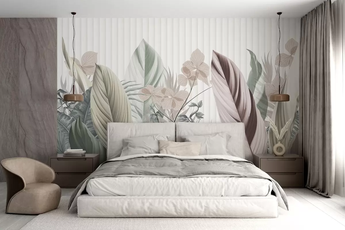 Fototapet Frunze tropicale cu culori pastelate moi, verde deschis, roz deschis și maro deschis, linii verticale în fundal Nr. w08892