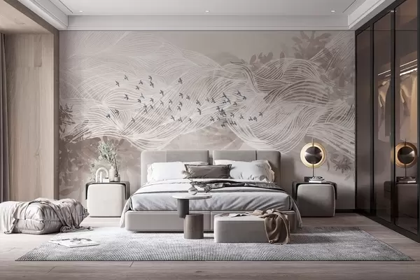 Fototapet Stol de păsări care zboară peste linie abstract arta peisaj texturat valuri bej, culori moi, design minimalist Nr. w08898