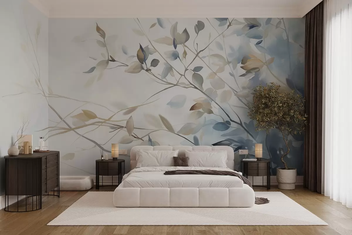 Fototapet Ramuri cu frunze în tonuri de albastru și maro, fundal deschis, moale și delicat, stil acuarelă Nr. w08900