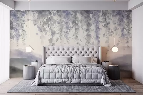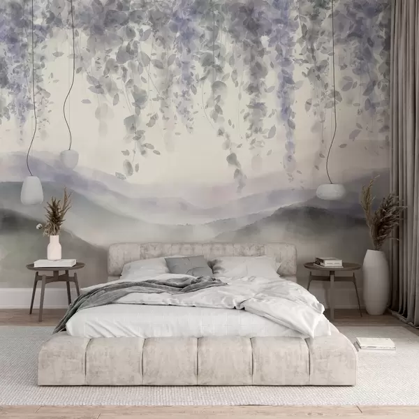 Fototapet Wisteria frunze agățat peste munți blured, moale pastel albastru și gri culori, peisaj stil acuarelă Nr. w08909