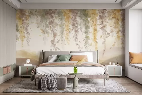 Fototapet Wisteria frunze agățat peste munți blured, moale pastel galben și maro culori, peisaj stil acuarelă Nr. w08909v1