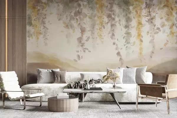 Fototapet Wisteria frunze agățat peste munți blured, moale pastel galben și maro culori, peisaj stil acuarelă Nr. w08909v1