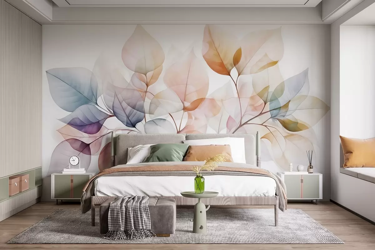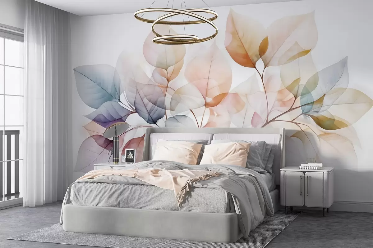 Fototapet Tablou acuarelă cu frunze translucide în culori pastelate, cu nuanțe de roz, alb, violet și albastru Nr. w08910