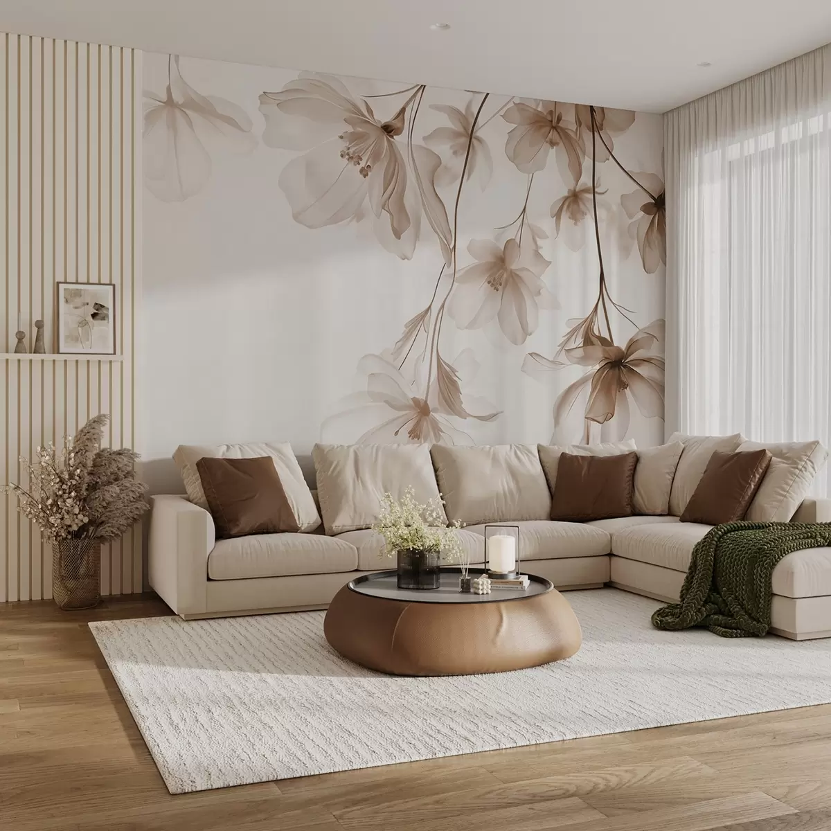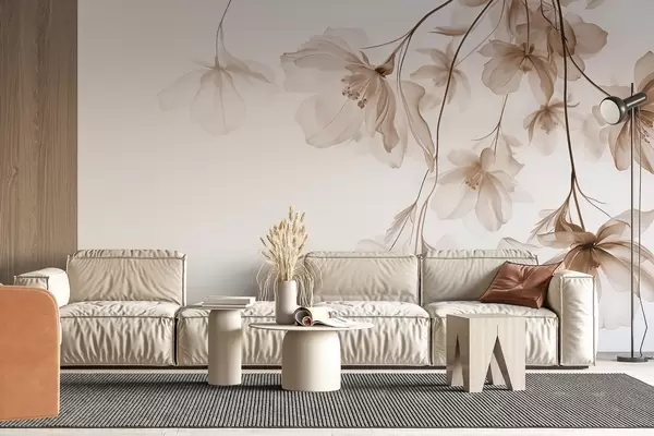 Fototapet Flori bej cu petale translucide agățate de o ramură, bej și alb, compoziție de artă modernă minimalistă Nr. w08911v1