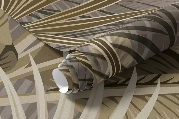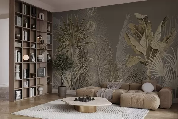 Fototapet Frunze tropicale în tonuri bej și maro, frunze de palmier, frunze de banane și ornamente mandala, fundal întunecat Nr. w08913v1