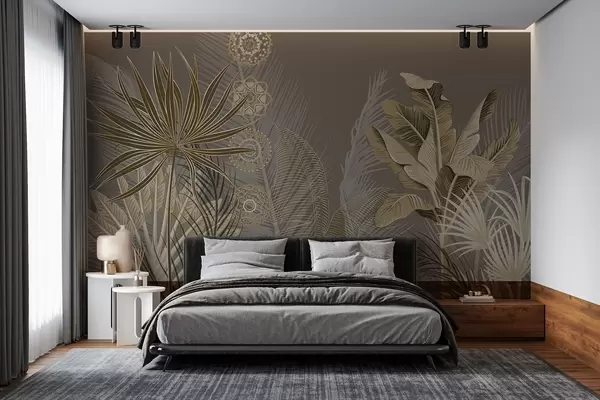 Fototapet Frunze tropicale în tonuri bej și maro, frunze de palmier, frunze de banane și ornamente mandala, fundal întunecat Nr. w08913v1