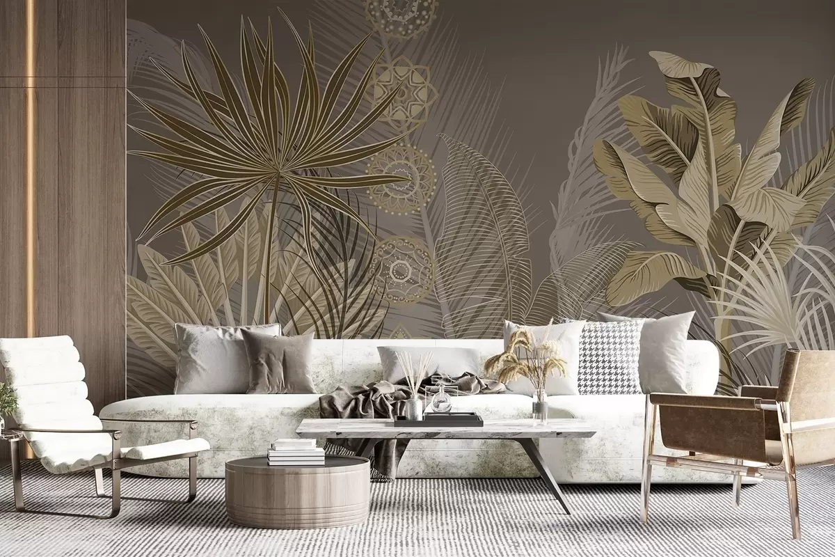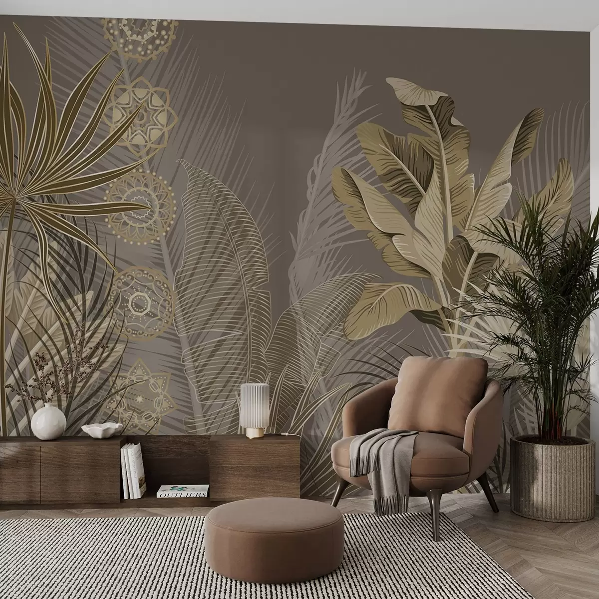 Fototapet Frunze tropicale în tonuri bej și maro, frunze de palmier, frunze de banane și ornamente mandala, fundal întunecat Nr. w08913v1