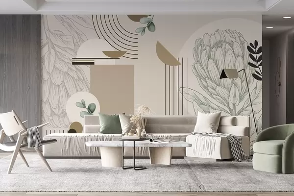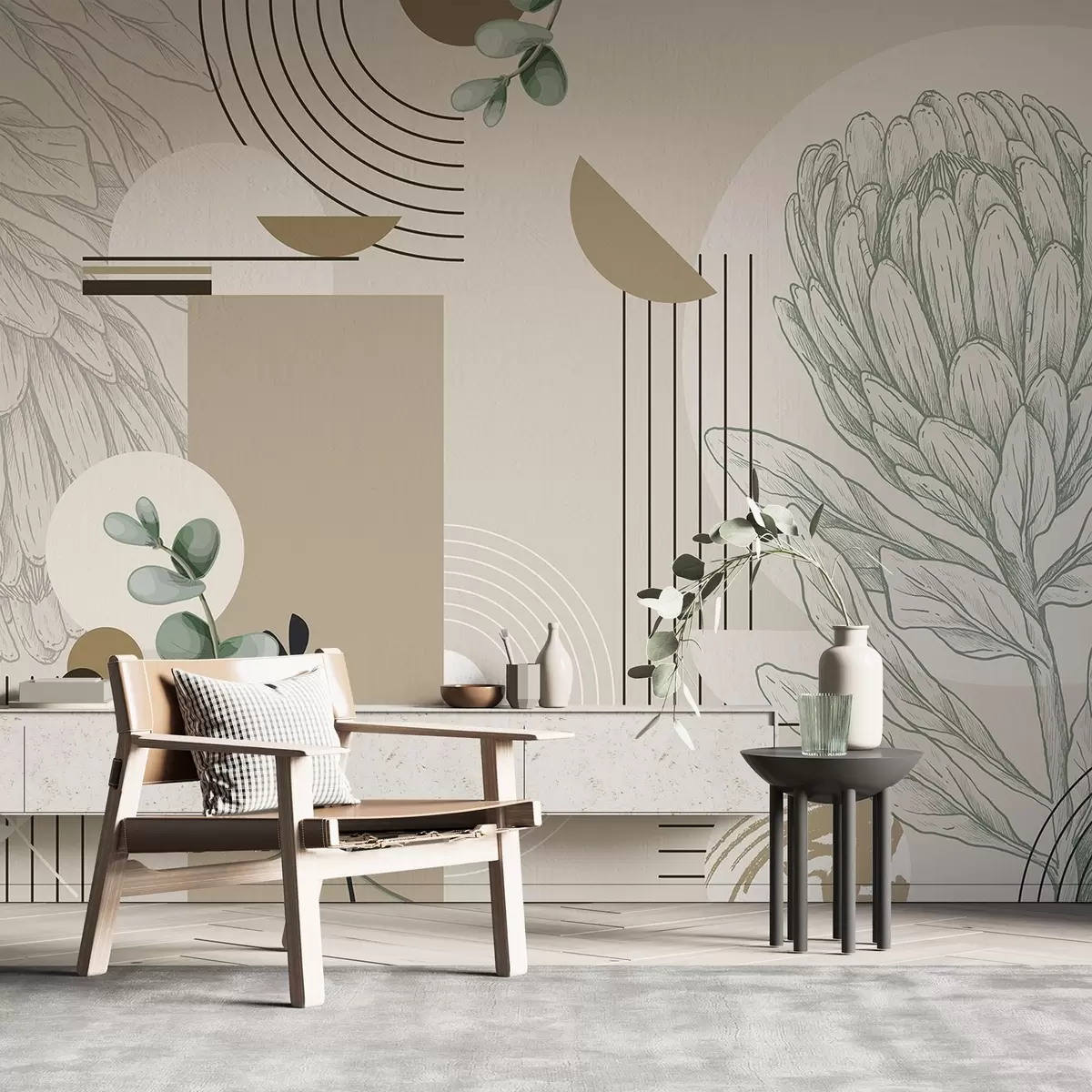 Fototapet Print botanic abstract cu flori de protea, frunze de eucalipt, forme geometrice în stil minimalist, culori pastelate Nr. w08914