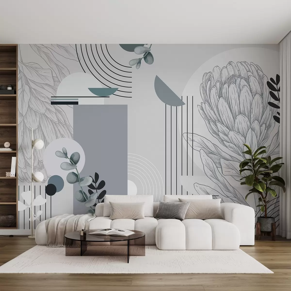 Fototapet Print botanic abstract cu flori de protea, frunze de eucalipt, forme geometrice în stil minimalist, culori pastelate Nr. w08914v1