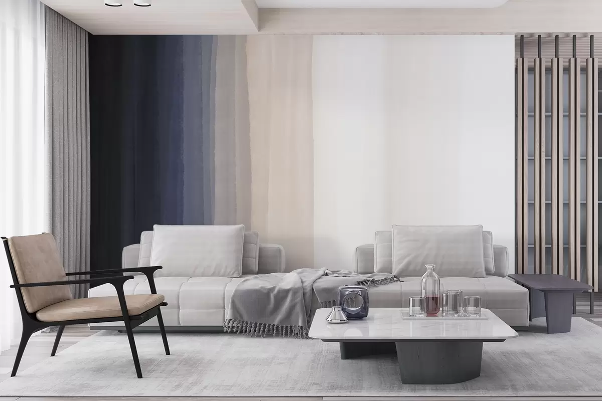 Fototapet Print gradient minimalist abstract cu dungi verticale de albastru închis, piersică deschisă și alb Nr. w08915v1