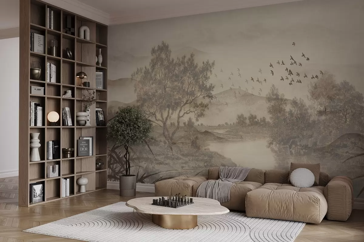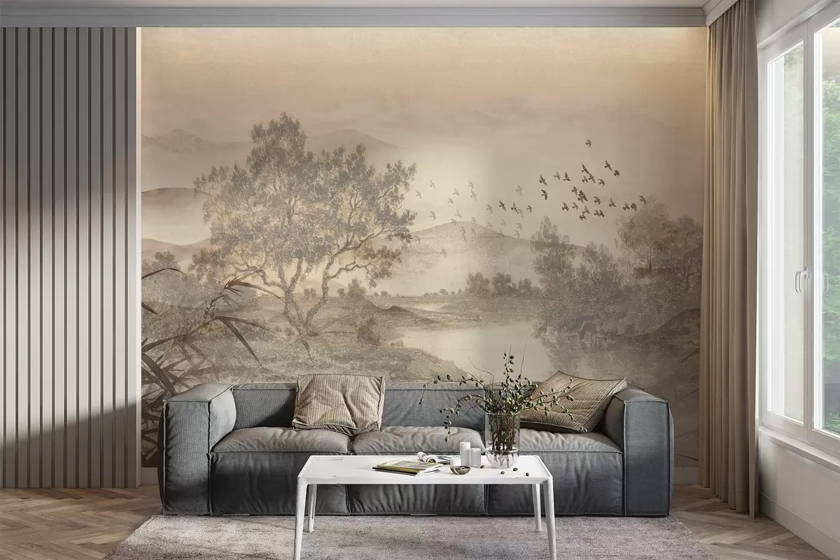 Fototapet Peisaj de epocă texturat cu un copac lângă râu și un cer înnorat, arta naturii în tonuri sepia Nr. w08920