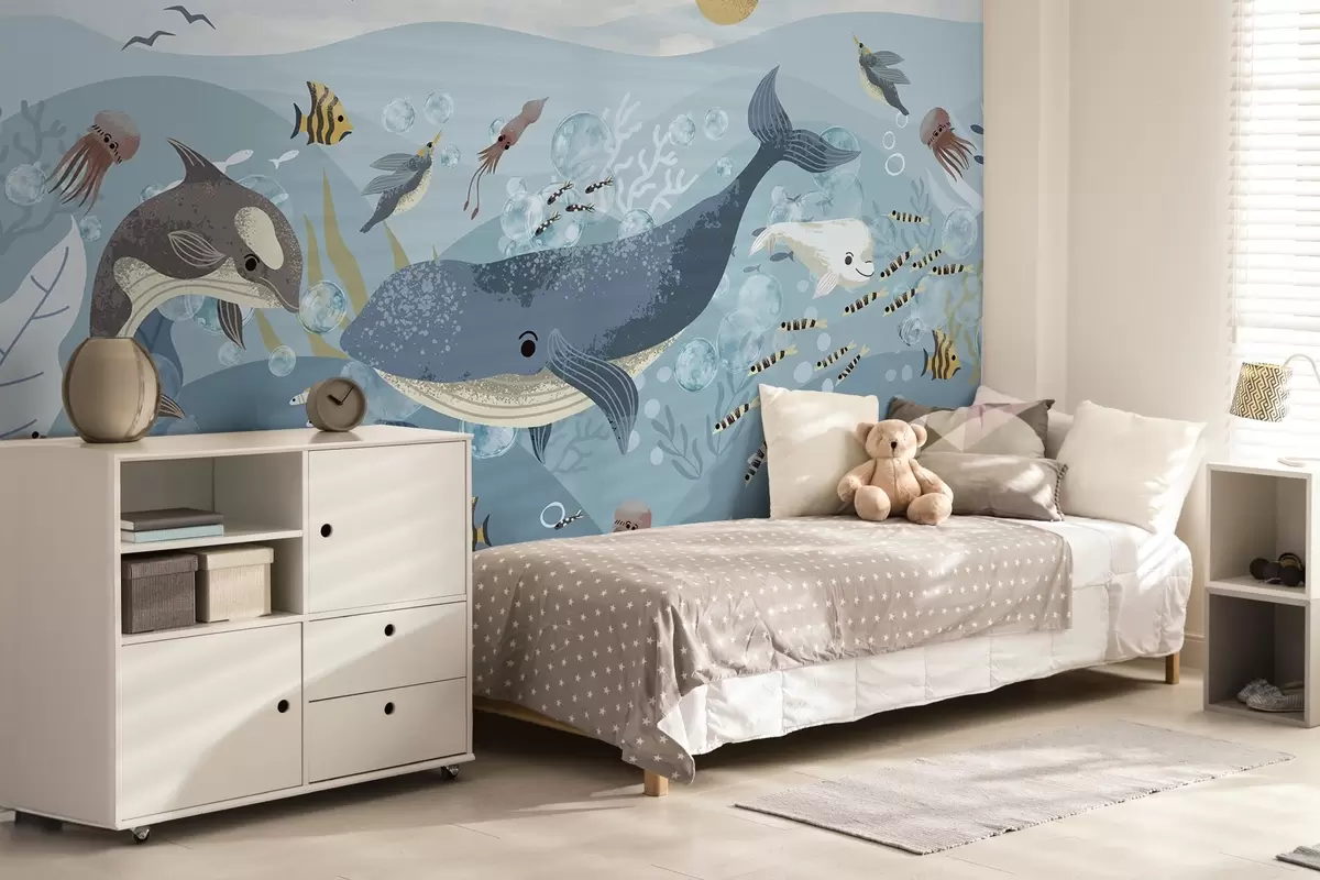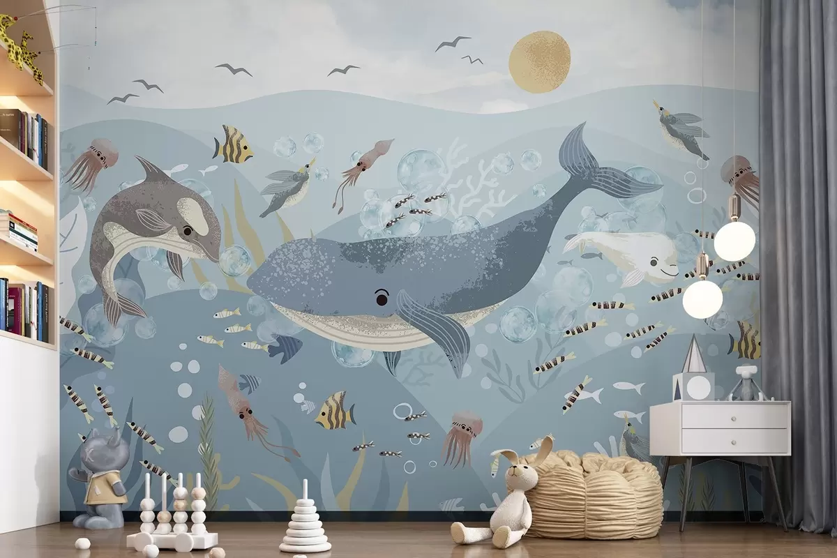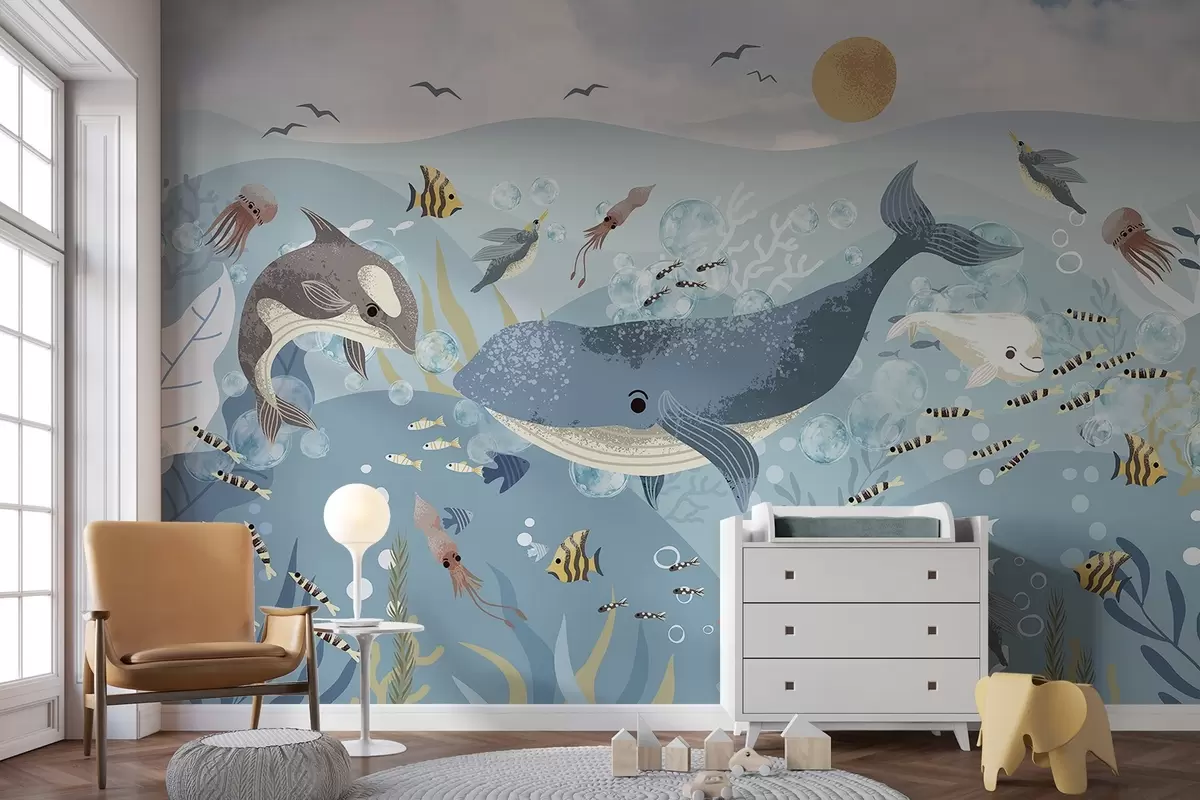 Fototapet Copii ilustrare imprimare drăguț cu balena albastră înconjurat de pești, calmarii, meduze într-un ocean albastru cu bule Nr. w08921