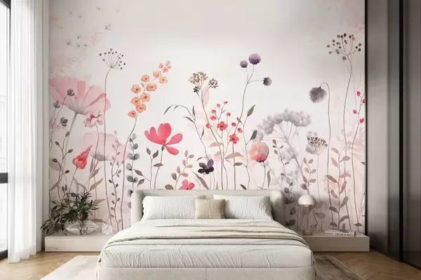 Fototapet Flori sălbatice în stil acuarelă cu maci, crizanteme, păpădii și iarbă Nr. w08956