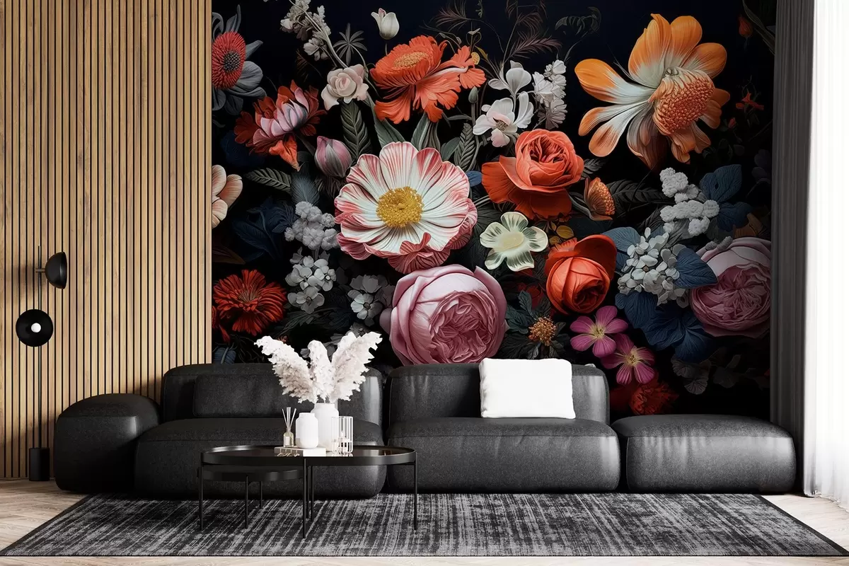 Fototapet Buchet colorat de flori diferite pe un fundal întunecat în tonuri reci Nr. w08969v1