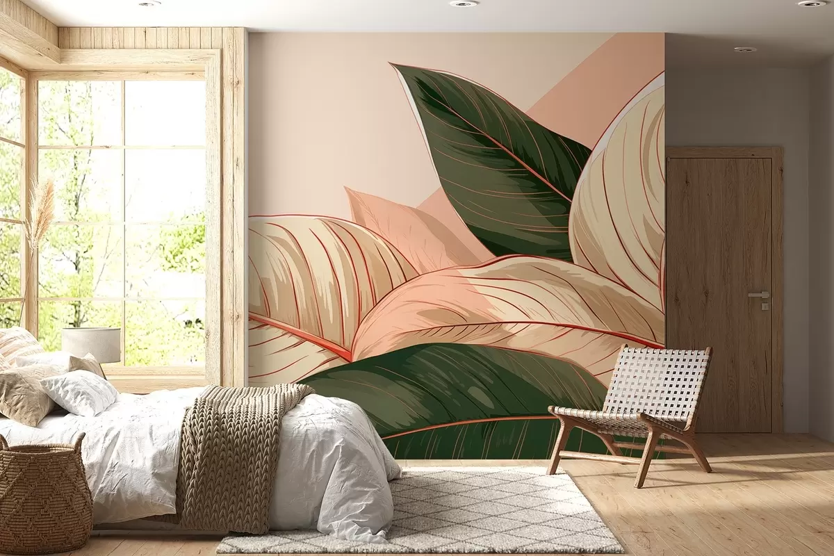 Fototapet Frunze tropicale mari verde-bej cu un fragment roz Nr. w08970
