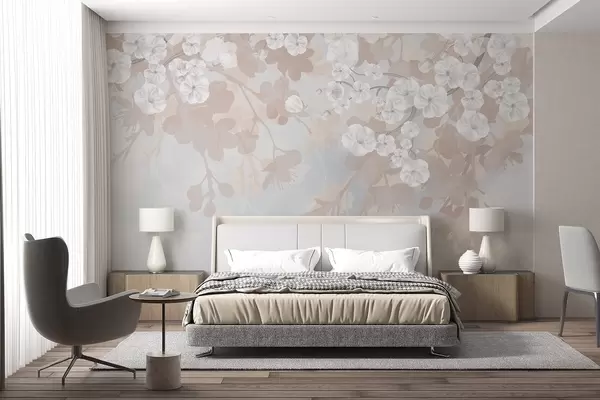 Fototapet Ramuri de flori de cireș cu flori albe și frunze gri, pe siluete florale elegante în culori pastelate moi Nr. w08973