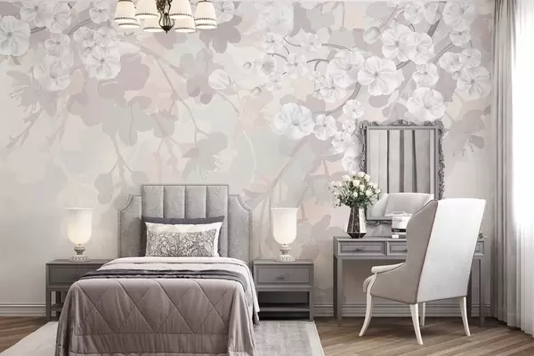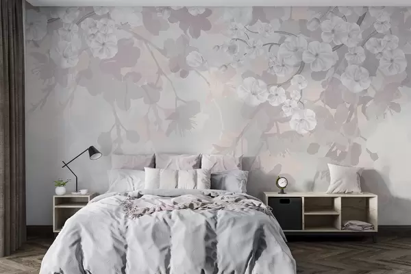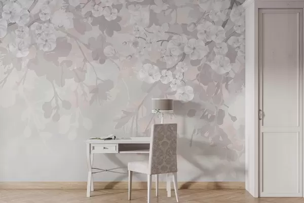Fototapet Ramuri de flori de cireș cu flori albe și frunze gri, pe siluete florale elegante în culori pastelate moi Nr. w08973v1