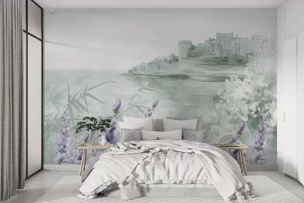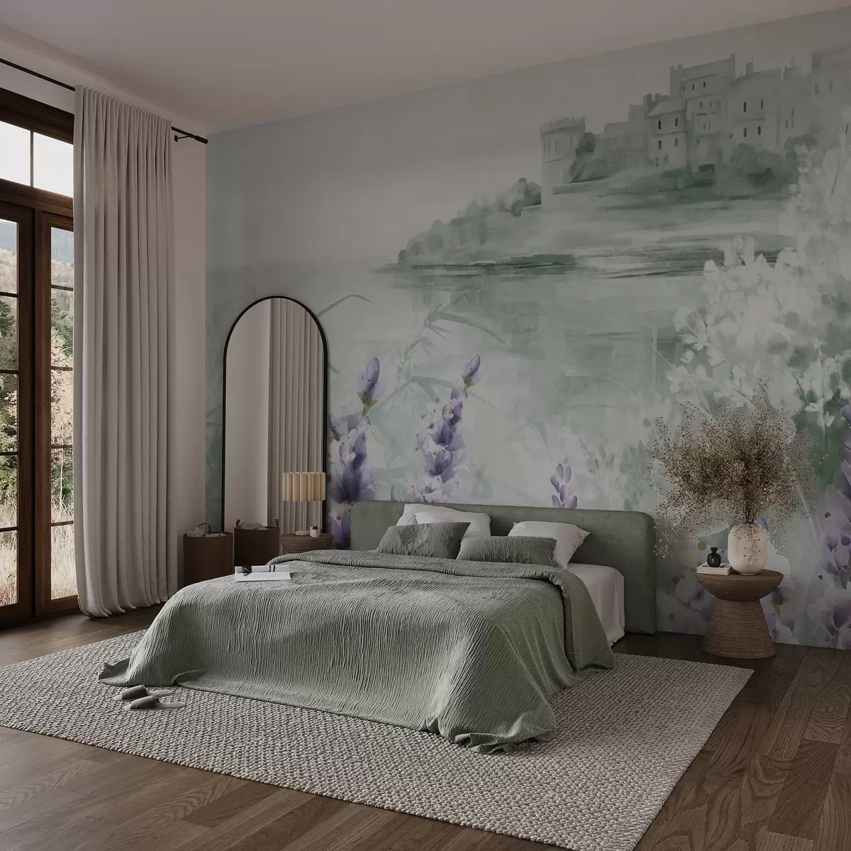 Fototapet Peisaj vintage texturat cu un castel pe o stâncă cu vedere la mare, cu flori de lavandă în culori atenuate Nr. w08975
