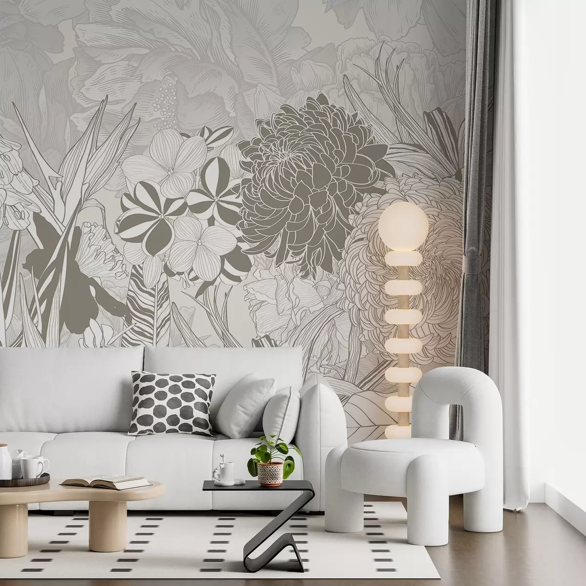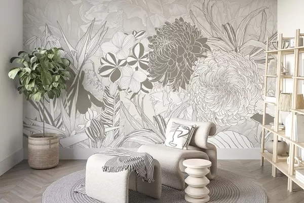 Fototapet Flori și frunze în tonuri de bej, inclusiv crizanteme, plumeria și frunze tropicale, design botanic Nr. w08976
