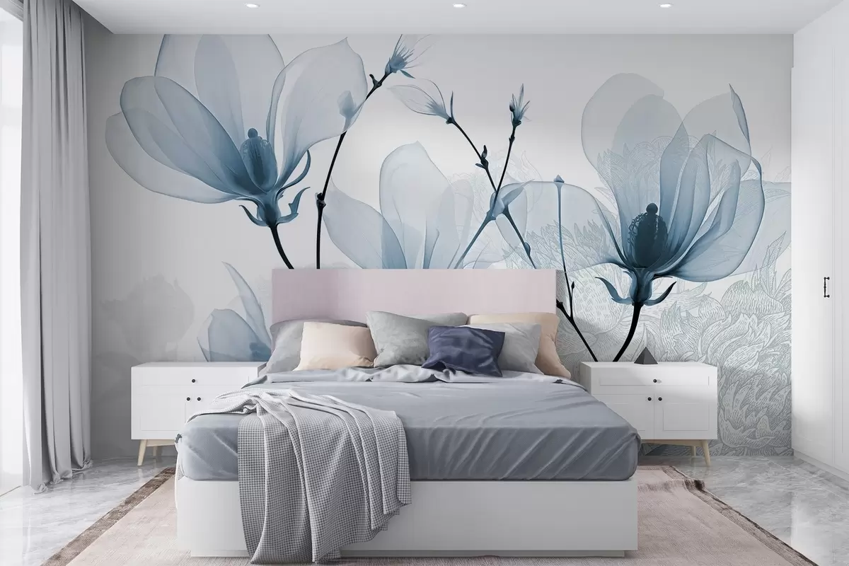 Fototapet Flori de magnolie albastru translucid cu siluete de flori cu petale delicate și tulpini întunecate Nr. w08978