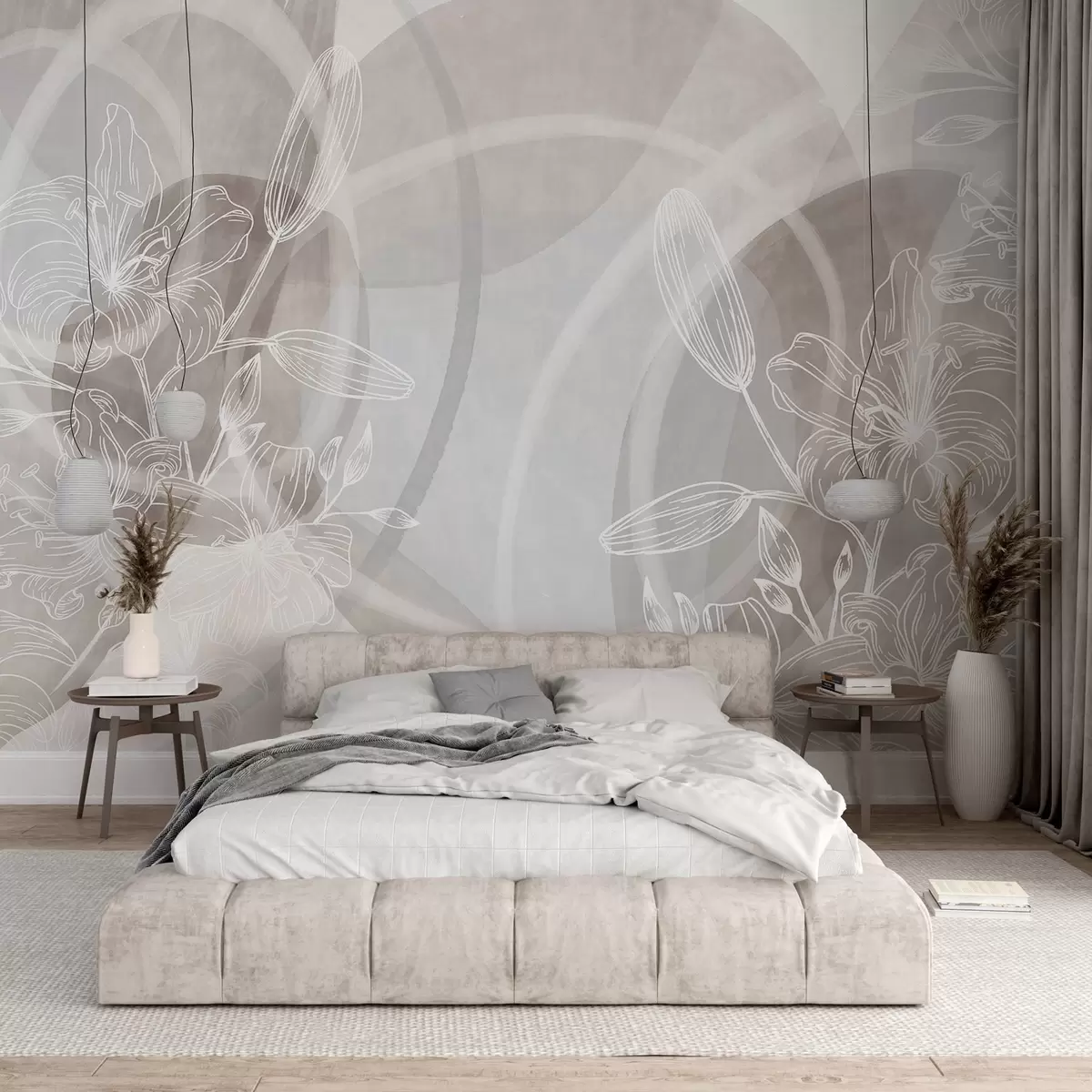 Fototapet Design floral minimalist cu flori și frunze albe line art, cercuri abstracte suprapuse în nuanțe de bej și albastru Nr. w08979v1