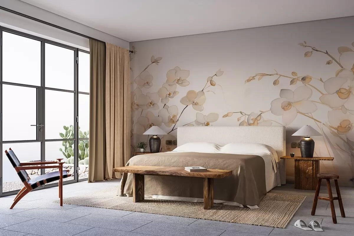 fototapet Orhidee bej în creștere pe laturile în apă în stil acuarelă w08998