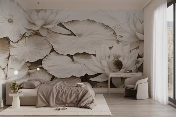 Fototapet Nuferi și nuferi într-un iaz, imitație maro și alb de desen în creion, ilustrație botanică detaliată, artă a naturii Nr. w09006v2