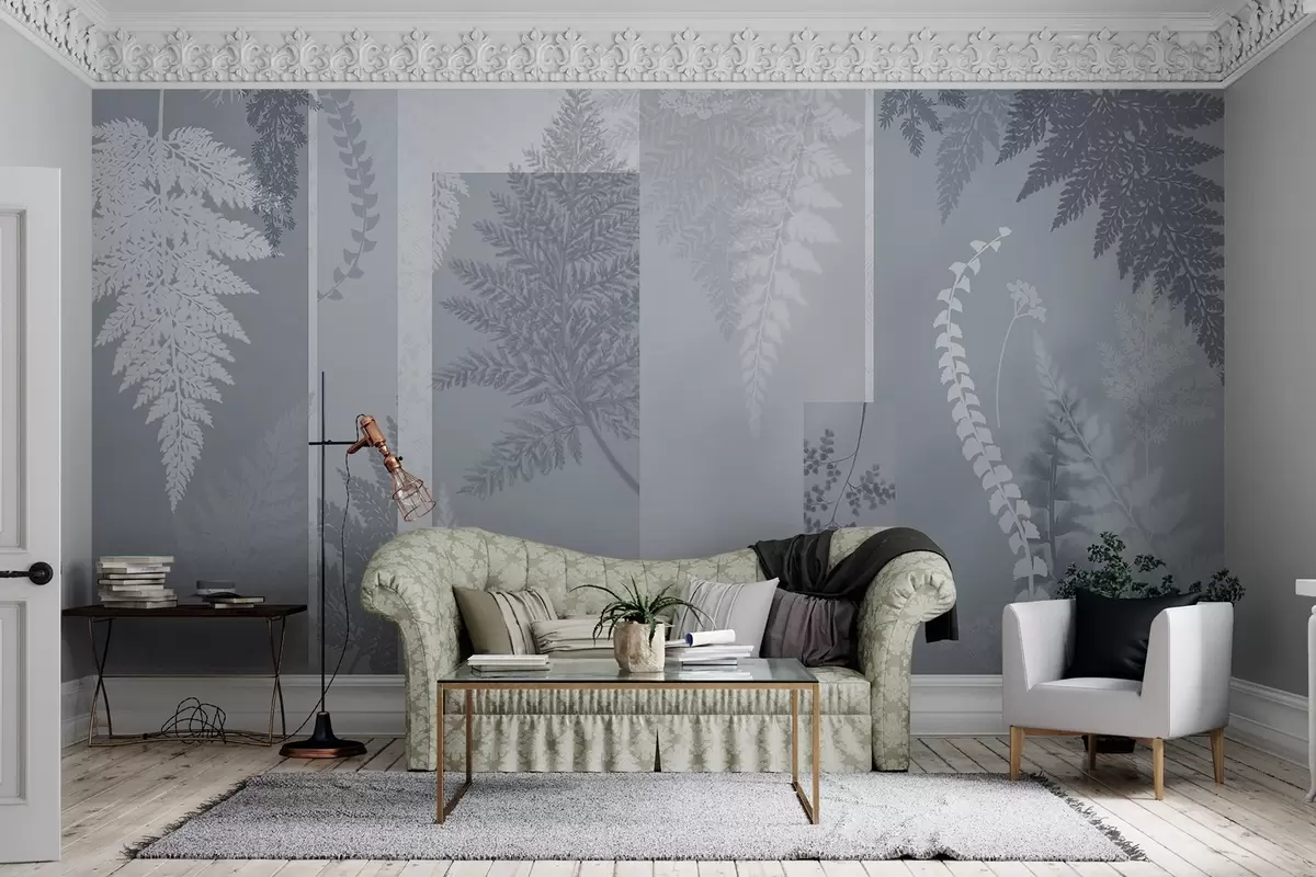 Fototapet Frunze de ferigă în albastru și alb, aranjate în dungi verticale, creând un imprimeu botanic și minimalist, culori moi și atenuate Nr. w09007v1