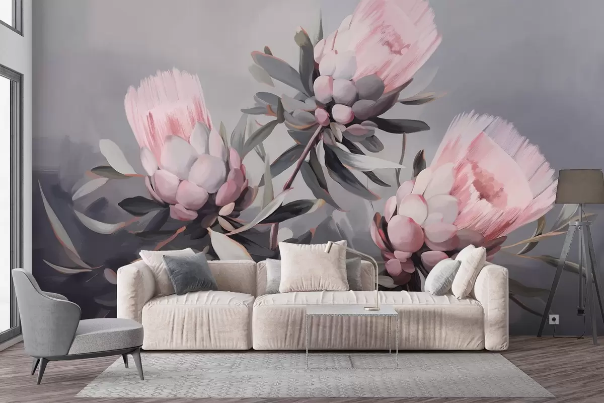 Fototapet Flori abstracte roz protea cu frunze gri, tușe de pensulă cu textură moale, culori atenuate, pe un fundal gri neclar Nr. w09014