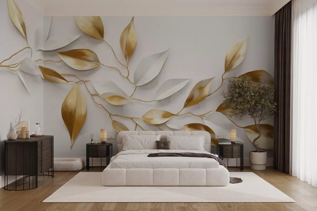 Fototapet Frunze galbene și albe pe o ramură , design elegant, fundal alb, stil minimalist, artă decorativă , inspirat din natură Nr. w09015