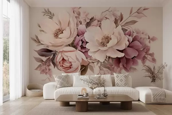 Fototapet Compoziție delicată de flori roz și bej, bujori cu frunze Nr. w09019