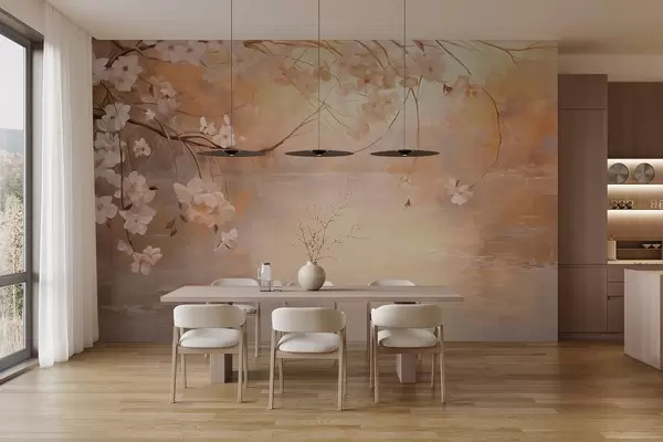 Fototapet Abstract peisaj arta cu ramură de flori și flori albe agățat peste un lac, culori pastelate moi Nr. w09046
